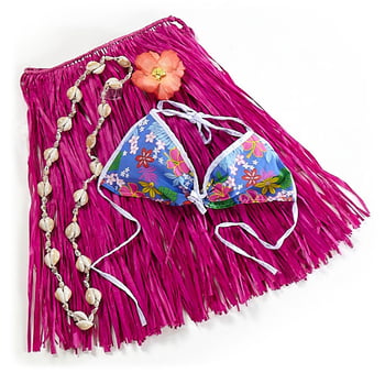 - Hula Skirt Set Includes: Natural raffia skirt , cotton bikini top, flower and shell lei.
